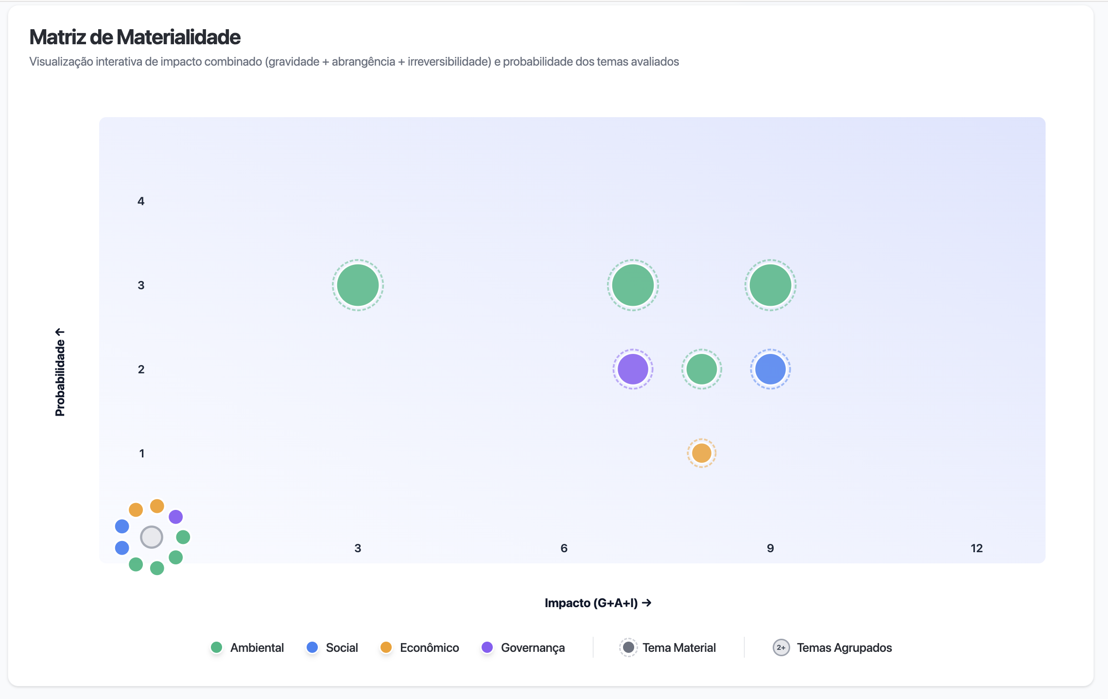 Com nossa ferramenta de Matriz de Materialidade, você identifica, prioriza e organiza os temas mais relevantes para seu negócio com base nos padrões GRI. Mais agilidade, precisão e estratégia para suas decisões de sustentabilidade.